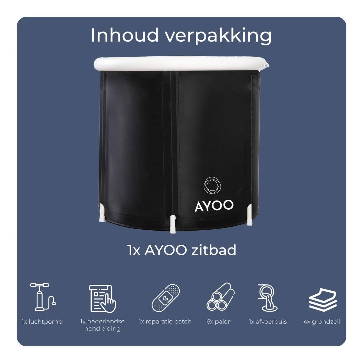 Het AYOO zitbad wordt inclusief voetpomp en Nederlandstalige handleiding geleverd. Wanneer je de handleiding volgt, is het erg eenvoudig om het zitbad op te zetten. Gebruik de meegeleverde voetpomp voor het oppompen van de opblaasbare rand en het zitbad is klaar voor gebruik. Na gebruik laat je het zitbad eenvoudig en snel leeglopen door middel van de twee afvoeren aan de onderkant. Laat het zitbad even drogen, om het vervolgens gemakkelijk op te vouwen.