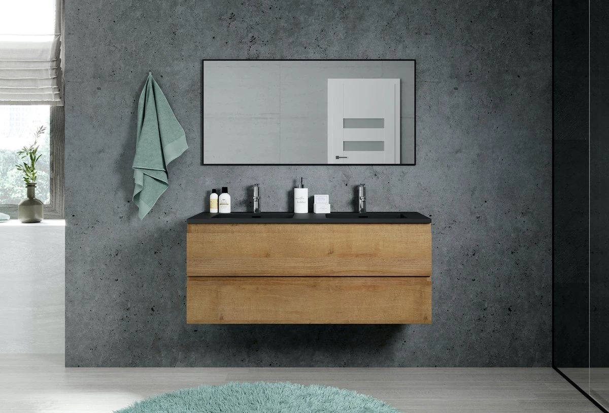 Badkamermeubel 120cm breed uitgevoerd met twee lades en dubbele wastafel. Uitgevoerd in een eiken kleur met een zwarte wastafel.Wastafel van kunstmarmer 120cm breed, 48cm diep. De onderkast is gemonteerd en met soft close afgesteld.Afmeting badkamermeubel: 120 x 48 x 53cm