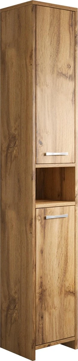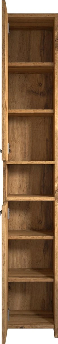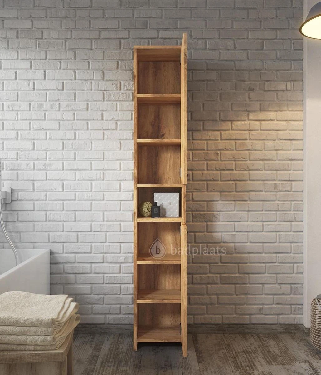 Staande badkamerkast Nemo is een stijlvolle kolomkast met meerdere opbergvakken voor extra opbergruimte in de badkamer. Vanwege zijn formaat is badkamerkast Nemo geschikt voor zowel grote als kleine badkamers. De kast is gemaakt van hoogwaardige kwaliteit spaanplaat voorzien van een fineerlaag. Montage is eenvoudig en al het benodigde montagemateriaal hiervoor is inbegrepen. De deuren van de kast kunnen zowel links als rechtsdraaiend gemonteerd worden. Deze kast wordt geleverd met pootjes waardoor deze niet aan de muur opgehangen hoeft te worden. De kast is uitgevoerd in eiken kleur.