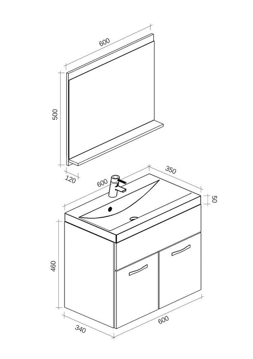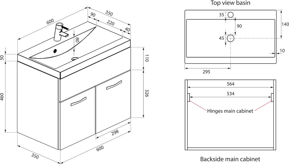 Onderkast met wastafel: 60 x 35 x 51 cm
