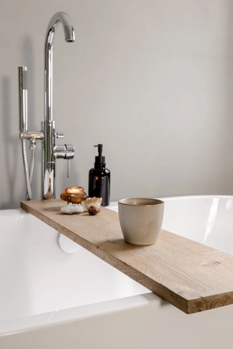 Onze luxe badplank past perfect in een moderne badkamer. De plank is vervaardigd uit massief eikenhout en geeft nog meer warmte in de badkamer.