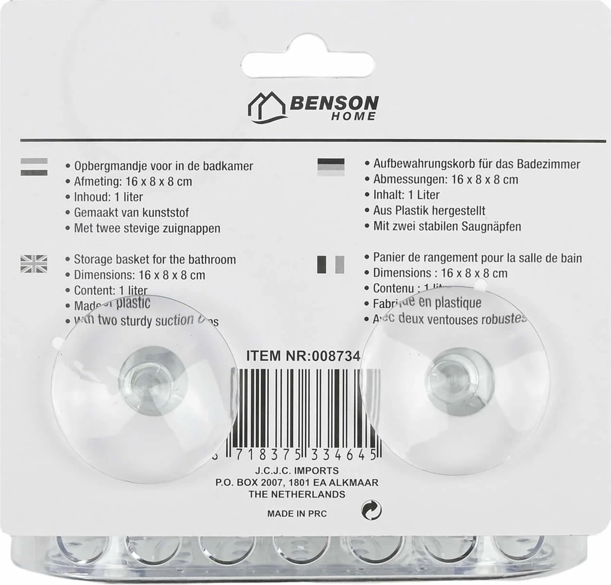 Douchebakje transparant met zuignappen 15.5 x 8 x 8 cm. Handig bakje om douche spulletjes zoals shampoo en douchegel in de badkamer te bewaren. Het bakje kan aan de muur worden bevestigd met de twee zuignappen, om zo extra ruimte te maken op de wastafel of in de douche. Materiaal: plastic. Afmeting: 15.5 x 8 x 8 cm. Inhoud: 1 liter. Kleur: transparant.