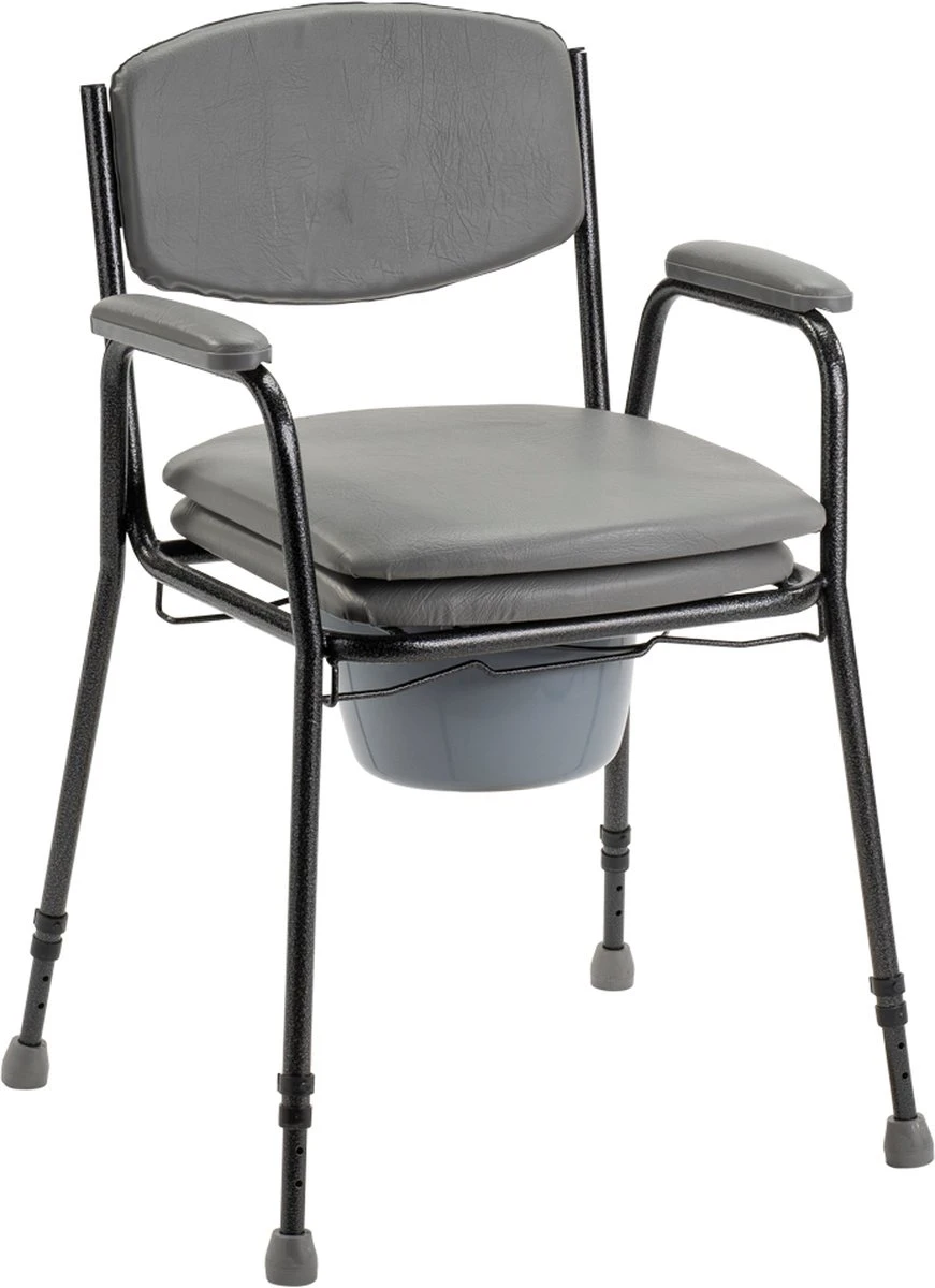 Deze in hoogte verstelbare toiletstoel is een stijlvolle en comfortabele Toiletstoel. Deze Toiletstoel heeft waterafstotende zachte bekleding en een gecoat metalen frame. De Toiletstoel is voorzien van een zachte zitting die over de opening geplaatst kan worden.