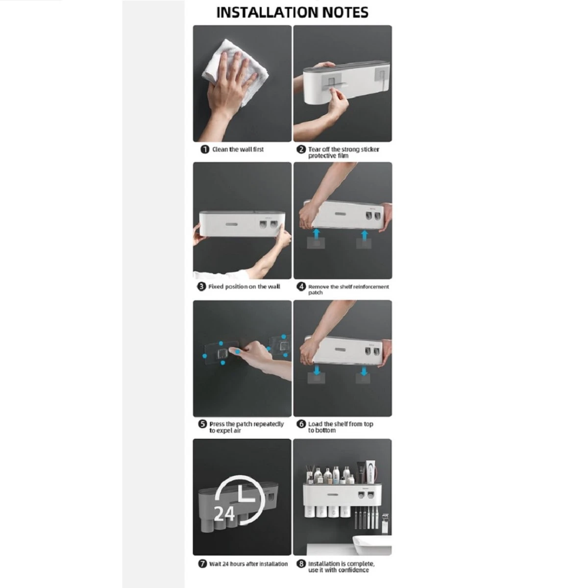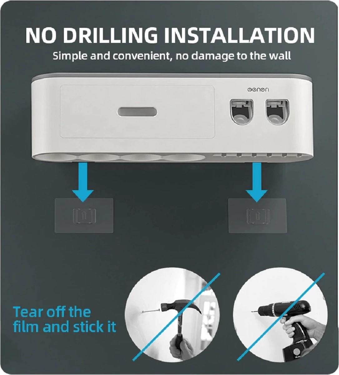 De tandenborstel organizer wordt geleverd met twee sterke zelfklevende haken die je op het muur kan plakken. Uiteraard is het belangrijk om de muur schoon te maken voordat de zelfklevende haken erop worden vastgeplakt. Vervolgens hoef je alleen 24 uur te wachten om de organizer op te hangen. De wachttijd is puur zodat de zelfklevende sticker goed vastplakt.