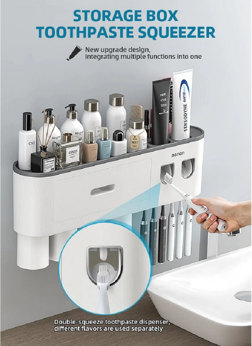 Deze tandenborstel organizer met automatische dispenser voor je tandpasta is voor velen een must have voor in de badkamer. Het kan in de badkamer gauw al rommelig worden door alle verschillende cosmetische en hygiënische producten. Denk bijvoorbeeld aan tandpasta, parfum, tandenstokers, watten staafjes, gezicht reiniging crème, et cetera.