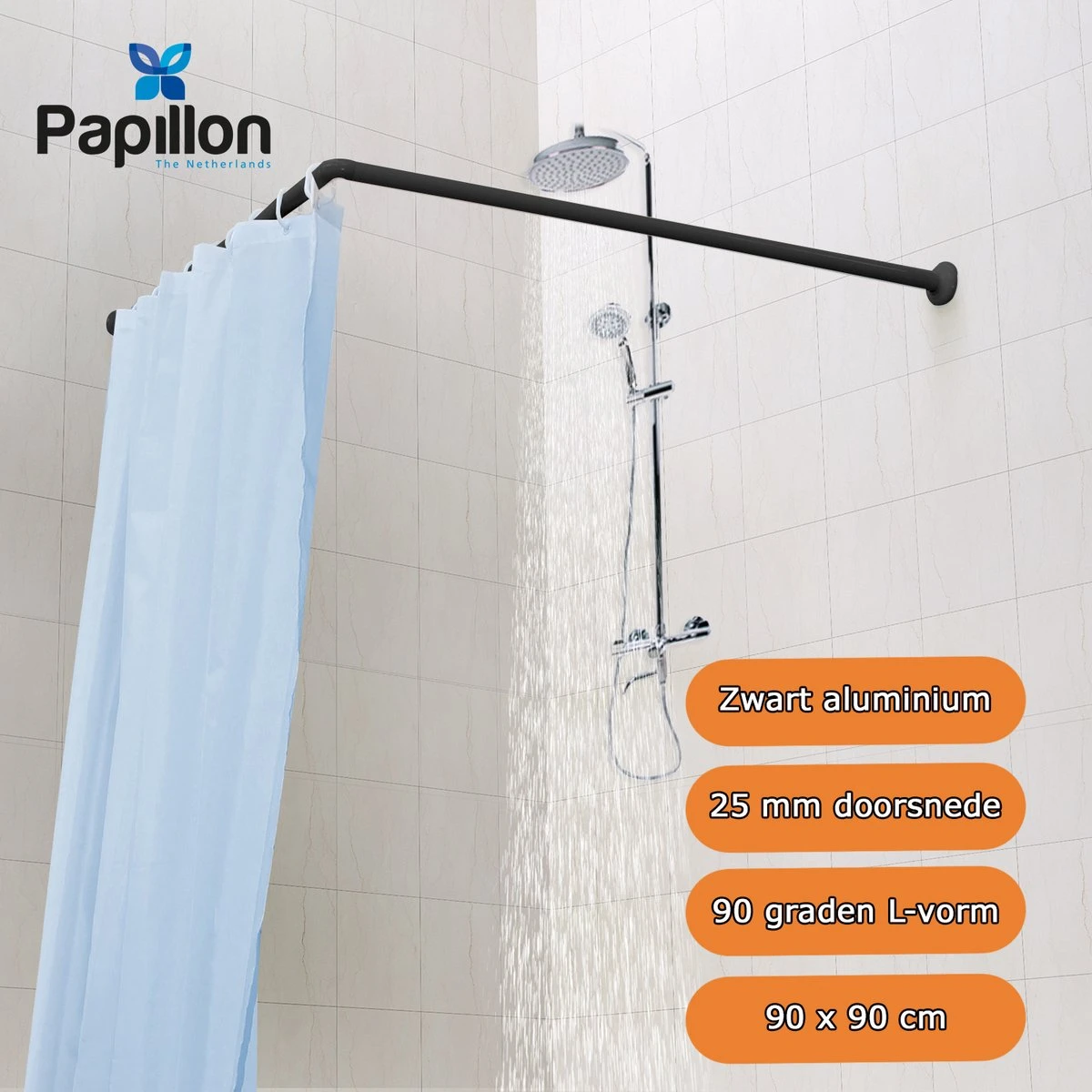 Zit de douche in een hoekje? Dan is deze Papillon Douchegordijnstang ideaal. De stevige aluminium stang is 25 mm dik en eenvoudig in de hoek als L-vorm op te hangen. Geschikt voor elk douchegordijn.
