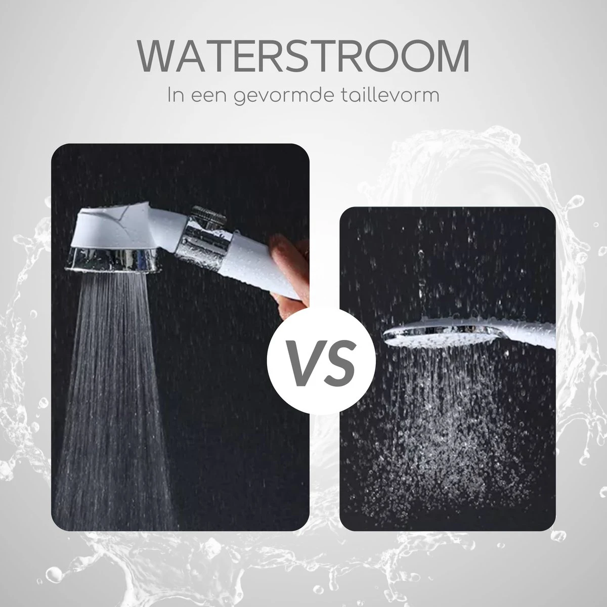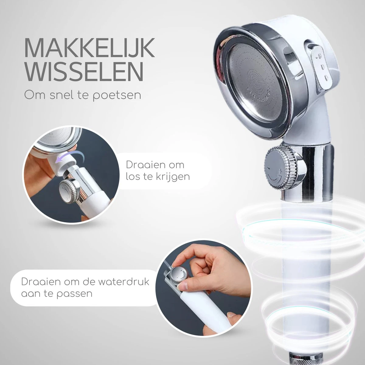 Je kan het water van de douche laten stoppen, door eenvoudig op te middelste stop-knop te drukken. Zodra je op de stop-knop drukt, zal de klep van de douchekop sluiten en zal er geen overbodig water meer uitdruppelen. Tevens is de kracht van het water moeiteloos te controleren door simpelweg te draaien naar de gewenste hoeveelheid water. Zo heb je altijd de correcte hoeveelheid water op je lichaam zonder dat je met gesloten ogen in het rond aan het zwaaien bent.