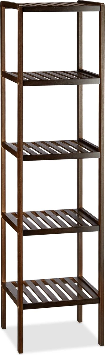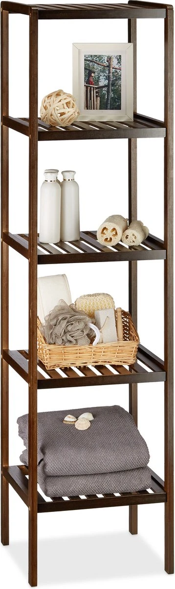 Dit staande rek uit bamboe schept orde in de badkamer, keuken en de gang. Op de 5 etages is genoeg ruimte voor handdoeken, boeken, schoenen etc. Doordat hij zelf weinig ruimte in beslag neemt is hij ook ideaal voor kleinere kamers. Het donkerbruine badkamerrek is een echte blikvanger. Doordat het rek open is, is het eenvoudig handdoeken, cosmetica en andere badkamerbenodigdheden uit het badkamerrek te nemen.