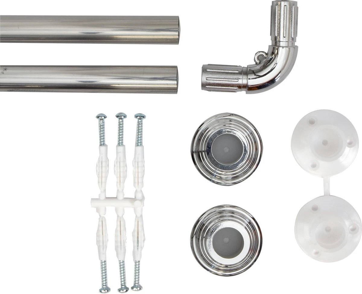Per uiteinde boort u 3 gaten in de muur op de positie waar de pluggen komen. De witte wandbevestiging schroeft u tegen de muur aan en daar bevestigd u de stang aan. De afdekvoeten shuift u over de wandbevestiging heen zodat het er netjes uit ziet. De hoek kunt u makkelijk in de buis schuiven en als alles juist gedaan kan de hoek geen kant op. Mocht er alsnog speling zijn dan kunt u een extra ophanging creeëren door het gaatje in de hoek te gebruiken.