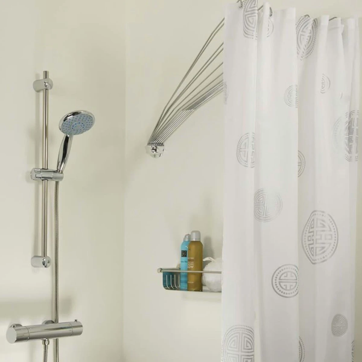 Het Sealskin Umbrella ophangsysteem van Sealskin is de ideale oplossing voor het ophangen van een douchegordijn wanneer er beperkte ruimte is in je badkamer. Je kunt bijvoorbeeld een douchecabine creëren in je badkuip zodat je kunt genieten van een ontspannende douche zonder dat heel je badkamer wordt nat gespetterd. Maar zelfs in de normale doucheruimte is dit ophangsysteem in de kleur chroom een goed alternatief voor de klassieke douchegordijnstang vanwege het kleine oppervlak: wanneer deze niet in gebruik is, kan hij eenvoudig en ruimtebesparend opzij worden gedraaid. De schroeven en pluggen voor een veilige wandmontage zijn inbegrepen. De 12 stangen bieden ondersteuning voor een douchegordijn met een breedte van 180 cm.