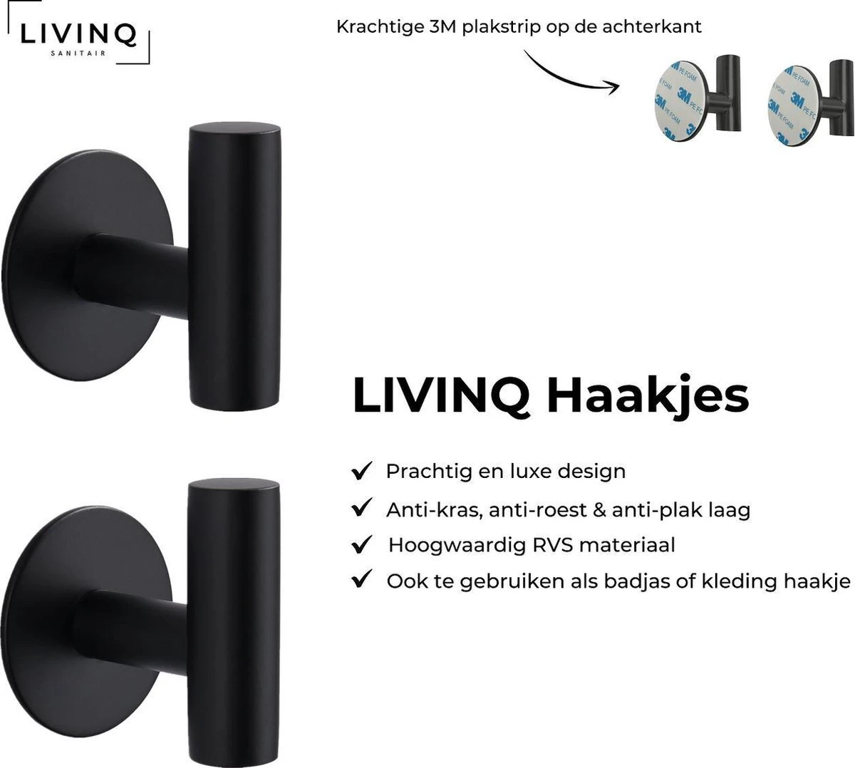 Het toiletset van LIVINQ bestaat uit een toiletborstel inclusief houder, een toiletrolhouder, twee handdoekhaakjes, en een reserverolhouder voor 3 rollen. De elementen uit deze set zijn allemaal gemaakt van RVS en hebben een afwerking in een fraaie, mat zwarte kleur. De toiletborstel heeft een bevestigingsplaatje die u vast kunt schroeven aan de muur. De toiletrolhouder, handdoekhaakjes en de reserverolhouder kunt u gemakkelijk bevestigen doormiddel van de krachtige plakstrip.